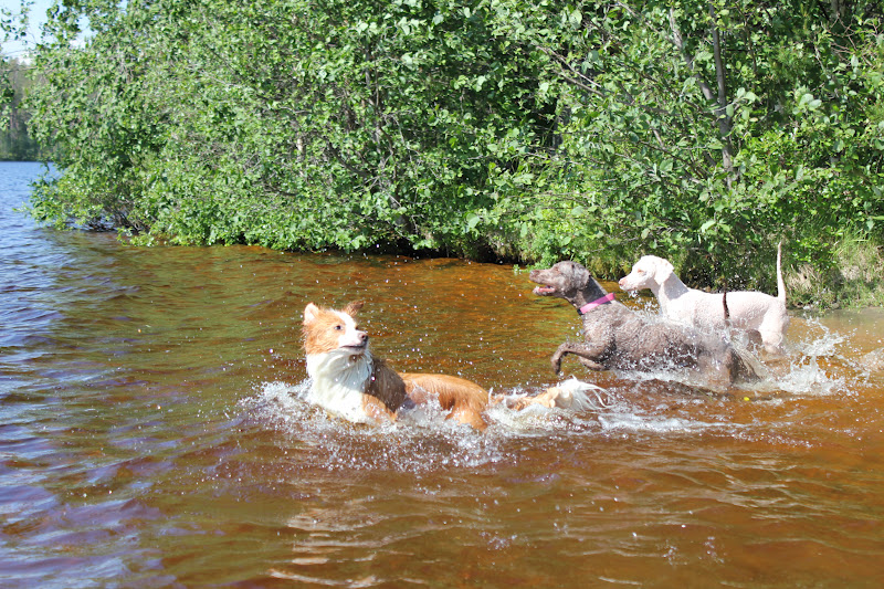Sunnuntaina käytiin sitten Helsingin herralle näyttämässä miten koirat täällä lenkkeilevät ilman hihnan hiertämää, tosin Oskulla oli hihnat perässä kaiken varalta, mutta miten hienosti se tuli luokse kutsusta.... Niin ja tietenkin oltiin lomiksessa